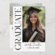 Las elegantes invitaciones para una fiesta de graduación planas presentan una foto vertical del graduado con un texto moderno decorativo en negro con serifas "Graduate" y texto que se puede personalizar con el nombre del graduado y el año de graduación. La parte trasera de la tarjeta incluye una segunda foto horizontal junto con una redacción de invitación a la fiesta de graduación personalizada que se puede modificar como desees. El esquema de color y diseño clásico en blanco y negro es perfecto para celebrar a tu graduado de secundaria o universidad.