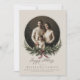 Elegante tarjeta de vacaciones con su propia foto familiar rodeada por una corona festiva con acentos de cinta roja. Los colores suaves y neutros y la vegetación crean un ambiente cálido y clásico, lo que hace que esta tarjeta sea perfecta para compartir con sus seres queridos los saludos de su temporada.