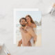 Esta invitación de boda presenta una serena escena de playa con dos personas disfrutando de un momento alegre, una llevando a la otra en su espalda. El diseño muestra una composición equilibrada con tonos suaves y cálidos de melocotón claro y blanco cremoso contra un fondo de azules apagados y beige arenoso, capturando un día soleado en la costa. La técnica de arte fotográfico enfatiza un estilo cándido y naturalista, evocando un ambiente alegre y romántico perfecto para celebrar el amor y la compañía en un entorno relajado junto al mar.