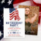 Salude a una notable carrera y celebre el viaje hacia una bien merecida jubilación con nuestra Invitación a la Fiesta Patriótica de Jubilación. Diseñada para honrar a aquellos que han servido en el ejército, la policía, el departamento de bomberos o se han graduado de una escuela militar, esta invitación emana orgullo y patriotismo. La parte delantera cuenta con un diseño fresco que presenta una bandera estadounidense pintada sobre un fondo blanco simple. Permite personalizar, lo que le permite agregar un toque personal con una foto y texto. Ya sea una fiesta de jubilación para un soldado, veterano del ejército, oficial de policía, personal de la marina, bombero, miembro de la fuerza aérea o un graduado de una escuela militar, esta invitación establece el tono para una celebración sincera. Esta invitación versátil también se puede utilizar para eventos del Día de la Independencia, mostrando colores como rojo, blanco y azul