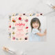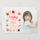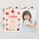 Carta de invitación para fiestas de cumpleaños de chica con ilustracion de ladybugs con flores silvestres. El texto dice "nuestra pequeña mariquita se está volviendo X". Puede añadir una foto a esta invitación.