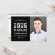 Anuncie su clase de 2023 con estilo de graduado de secundaria con esta invitación de graduación e invitación a la fiesta. La tarjeta de dos caras presenta un diseño sencillo y masculino con letras inspiradas en la camiseta deportiva, perfecto para tu estudiante de estrella y atleta de la universidad. Color negro, gris plateado y blanco. Espacio para incluir una foto senior en la parte delantera con la palabra de invitación de la fiesta en la parte posterior. Todos los colores se pueden personalizar.