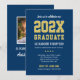 Celebre a su graduado de la promoción de 2026 con esta invitación de graduación de la promoción varsity azul marino y dorado que presenta un titular de año audaz y un diseño moderno y limpio. Personalice el nombre del graduado, la escuela, la fecha, la hora y los detalles de RSVP. La parte posterior incluye un diseño de foto coordinado con “clase de 2026” para un aspecto pulido a dos caras.