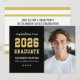 Anuncia a tu graduado de secundaria de la clase de 2023 con estilo con este anuncio de graduación y invitación a la fiesta. Tarjeta de dos caras con un diseño simple y masculino con letras inspiradas en jerseys deportivos, perfecto para tu estudiante destacado y atleta de equipo. Colores negro, dorado y blanco. Espacio para incluir una foto de último año en la parte frontal con el texto de invitación a la fiesta en la parte posterior. Todos los colores se pueden personalizar.