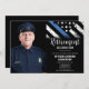 Este diseño incluye una bandera de la fuerza policial con rayas blancas y negras, y una delgada franja azul. La insignia de la policía y el texto de oro se asientan sobre todos los detalles del fiesta para los detalles del fiesta de retiro del oficial de policía, sheriff, capitán o jefes que se retira. Personalizar este diseño aún más con la foto del policía que se retira.