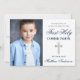 Elegante invitación a la Santa Comunión con cruz y foto en azul y plata.