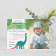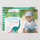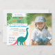 Silueta de dinosaurio turquesa linda y única en combinación con letras de texto coloridas, brillantes y alegres. Invitación de cumpleaños moderna, trendy y adorable para la fiesta de cumpleaños de un niño pequeño, con foto personalizada. ¡Joven, salvaje y tres! ¡Todos los elementos gráficos son gratuitos para cambiar!