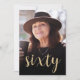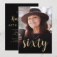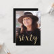 La parte delantera de esta invitación a los 60 años muestra la foto del invitado de honor con un texto de color dorado. La palabra "sesenta" aparece en un elegante guión de caligrafía de color dorado. Una pantalla oscura ayuda a hacer que el texto aparezca. Personalizar el reverso con el nombre y los detalles del fiesta en un fondo negro. ¡Una gran manera de celebrar a alguien que cumple sesenta años!