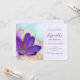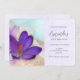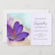 Invitación de cumpleaños con una encantadora fotografía de un oscuro crocus púrpura dentro de un frasco de vidrio. Una flor violeta en el fondo.