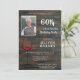Invitación a la foto del Fiesta Rústico Red Wine Wood 60th Birthday Surprise. Invitación de cumpleaños con un fondo rústico de madera oscura y vidrio abstracto con vino tinto. El texto está en un guión blanco de moda y es fácilmente personalizable - personalizarlo con tu foto, nombre, edad, fecha, ubicación y RSVP. Puede cambiar todo el texto de la invitación. Invitar por 60 años a una fiesta de cumpleaños sorpresa para un hombre o una mujer.