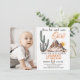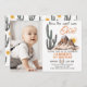 Foto del Oeste del Lado Retro - Occidente fue una invitación al primer cumpleaños Cute, la invitación al primer cumpleaños, la invitación a un niño de temática occidental con un paisaje de cactus del desierto, estilo de cuerda palabra uno, herradura dibujada a mano y una foto en un lado. La invitación para el primer cumpleaños de este muchacho salvaje del oeste también incluye una foto y un texto en la parte trasera y es ideal para una fiesta de primer cumpleaños con temática occidental.