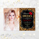Foto Dulce 16 Cumpleaños - Invitación impresa del leopardo de Beso Rojo. Dulce invitación de fiesta de cumpleaños con tu foto. Presenta impresión de leopardo, fuente de escritura, beso de labios y confeti. Diseño de temática animal de lujo con oro falso purpurina. Perfecto para una elegante celebración del día 16.