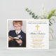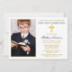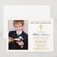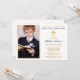 Invitación moderna y elegante de oro y azul marino para la primera comunión con cruz de oro y foto.