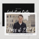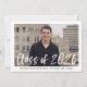 Tarjetas de invitación elegantes y modernas para fiesta de graduación con la foto del graduado enmarcada en blanco con "Clase de 2026" en una superposición de letra de pincel acuarela blanca. Personaliza la portada añadiendo el nombre del graduado y el nombre de la escuela en texto negro. El reverso de la invitación muestra los detalles de la fiesta de graduación en texto blanco sobre fondo negro sólido.