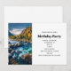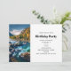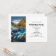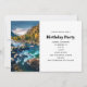Una invitación de cumpleaños con una fotografía escénica que presenta montañas cubiertas de árboles en colores de otoño. Un río que fluye alrededor de las rocas. Una gran luna llena blanca se cierne sobre ella.