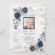 Una bella y moderna invitación al funeral o al servicio conmemorativo que incluye una foto del fallecido sobre un fondo de mármol de la carrera de la carrera, decorada con flores de color rosa en azul marino y rosa rubor. La parte posterior de la tarjeta presenta una textura de trazo acuarela en azul marino. Copyright Elegant Invita, todos los derechos reservados.
