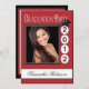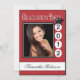 El casquillo del comienzo se sienta encima de fecha de encargo de la graduación. Cargue su imagen de la High School secundaria o de la universidad y personalice su nombre en el frente. Complétele los detalles del fiesta en la parte posterior. Mostrado en el rojo, blanco y negro de las expresiones de papel.