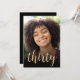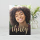 La parte delantera de esta invitación para cumplir 30 años muestra la foto del invitado de honor con un texto de color dorado. La palabra "treinta" aparece en un elegante guión de caligrafía de color dorado. Una pantalla oscura ayuda a hacer que el texto aparezca. Personalizar el reverso con el nombre y los detalles del fiesta en un fondo negro. ¡Una gran manera de celebrar a alguien que cumple treinta años!