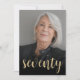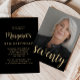 La parte delantera de esta invitación para cumplir 70 años muestra la foto del invitado de honor con un texto de color dorado. La palabra "setenta" aparece en un elegante guión de caligrafía de color dorado. Una pantalla oscura ayuda a hacer que el texto aparezca. Personalizar el reverso con el nombre y los detalles del fiesta en un fondo negro. ¡Una gran manera de celebrar a alguien que cumple setenta años!