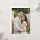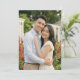 Esta invitación de boda presenta una romántica escena al aire libre con una pareja que está muy cerca una del otro, rodeada de exuberante vegetación y vibrantes flores rojas. El diseño muestra una paleta de colores suaves de azul claro, beige y crema, complementada por los ricos verdes y rojos brillantes del entorno del jardín. Capturada con fotografía de alta resolución, la imagen enfatiza la belleza natural y la calidez, creando una atmósfera acogedora y alegre perfecta para celebrar el amor y la felicidad en su día especial.