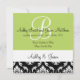 Foto de patrón de damasco verde claro, negro y blanco guarda las tarjetas de fecha monogramadas con tu monograma, inicial y nombra una tarjeta plana con tu foto de compromiso en la parte delantera y tu texto en la parte posterior. Plantilla de personalizable completo. Elke Clarke© Una hermosa manera de anunciar a sus invitados el día de su boda con este moderno diseño con elementos tradicionales como el patrón de damasco vintage. Perfecto para una boda de primavera o un boda de verano. Para otros colores de damasco, póngase en contacto con luxuryweddinginvitations@gmail.com