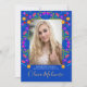 Invitación mexicana a la Fiesta Quinceanera con foto personalizado, para la celebración del 15 aniversario de su hija. Este tema floral de la quinceañera presenta coloridas flores de arte folclórico mexicano en rojo, rosa, morado y amarillo sobre un fondo azul real. La parte trasera de la tarjeta tiene un ramo de flores de flores de la misma fiesta. La plantilla está preparada para que usted personalizar la tarjeta con todos sus datos personales para su fiesta de Fiesta Quinceanera mexicana. Por favor, busque en nuestra tienda los artículos que coincidan y coordinen.