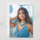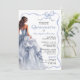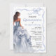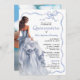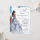 Una invitación moderna de Quinceañera que exuda elegancia y encanto, este diseño femenino tiene un hermoso ilustracion de un vestido de bola azul como punto central. El vestido, hecho de delicadas capas de tul y satén, fluye con gracia, brillando en hermosos tonos azules. El texto de la invitación está bordeado por un delicado marco de cinta azul de vieiras que añade un toque de suavidad y sofisticación. El marco está intricadamente atado en una proa en la parte superior, con las colas que caen en cascada, lo que realza la elegancia general del diseño. La parte de atrás de la invitación tiene una plantilla de fotos para incluir una foto de la celebración de cumpleaños mientras se prepara para celebrar este importante hito de pasar a la edad adulta. La estética general es de belleza y lujo, creando una sensación de anticipación para la gran celebración que viene. Esta invitación puede solicitarse como invitaciones impresas o descargarse como invitación digital.