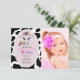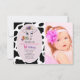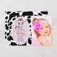 Cuta, rosa vaca sagrada con corona floral invitación de primer cumpleaños con foto y huella de vaca.