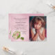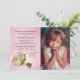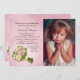 Un encantador ramo rosa y blanco con un fondo radiante rosa crea una bella invitación de la Primera Comunión para una niña.