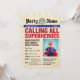 Personalice esta invitación al estilo de este periódico de superhéroes con toda su información de cumpleaños y cargue fácilmente su propia foto. Introduzca rápidamente su información o personalizar adicional y reorganice los elementos y el texto pulsando el botón "personalizar".