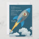 Ten un soplo de fiesta y empieza con nuestra Invitación al Viajero Espacial que presenta un cohete gris y azul a mitad de vuelo. Una ventana redonda de fotos muestra la cara de tu sonriente niño. (FP)