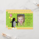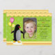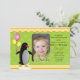 Un adorable diseño unisex con globos de pingüino. El fondo verde, polka punto tiene un toldo amarillo/naranja, vieiras y muestra la foto del niño de cumpleaños.La tarjeta es fácil de personalizar con su redacción, fuente, color de fuente y elección de seis tipos de papel.