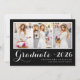 ¡Celebremos al graduado! Invite a sus invitados a su evento con esta invitación de graduación de foto personalizable. Cuenta con caligrafía moderna y un formato de diseño de tres fotos. Personalízalo añadiendo tus datos. Esta invitación de graduación de foto en blanco y negro también está disponible en otros colores y cartulinas.
