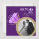 Invite a sus amigos y familiares a una fiesta especial de aniversario de bodas número seis o celebración de cena con estos anillos de eternidad gráficos de oro, con destellos blancos, púrpura oscuro y púrpura brillante amatista, y dos fotos de entonces y ahora en las invitaciones. Personalizadas con sus propias fotos del día de la boda de su pareja y una foto actual en el reverso, luego agregue sus propias palabras de celebración, fecha de la fiesta y lugar. Otros artículos coincidentes están disponibles. Arte y diseño gráfico original del anillo por www.mylittleeden.com en Zazzle.