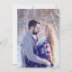 Boda de invierno púrpura con pinos cubiertos de nieve blanca cerca del lago arte e invitaciones fotográficas. Personaliza con tus propios detalles de boda y tu foto favorita al revés. Ideal para Navidades o bodas de invierno junto al lago. El título dice: Esta es la temporada para casarse. © Gouache y acuarela árboles pintados a mano a orillas del lago y diseño de Sarah Trett para www.mylittleedenweddings.com