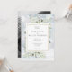 Con delicados copos de nieve que caen sobre el follaje verde en un fondo de escarcha invernal. Los detalles de su boda están enmarcados en un borde geométrico dorado elegante con su foto especial en el reverso. Diseñado por Thisisnotme©