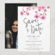 Un estallido de flores de cerezo de primavera, pintadas en acuarela, decora esta moderna y juguetona pero clásica y elegante, simple y distinguida tarjeta de boda de "save the date". Perfecta para novias que aman los diseños clásicos y atemporales pero también modernos y divertidos, bodas de jardín, bodas de primavera o verano y flores de cerezo. También para amantes del estilo boho chic y para bodas románticas o rústicas. Plantilla para una foto de compromiso (o cualquier otra de su elección) de la feliz pareja en el reverso.