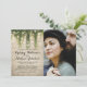 Tarjetas de invitación de boda de cuento de hadas mágico con un fondo de pared de ladrillo de piedra rústica, una foto de la pareja comprometida, vid verde, luces de hadas brillantes y una plantilla de boda moderna.