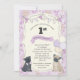 Invitación a la fiesta de cumpleaños con temática de cachorro Pug con tema de color púrpura pastel y sala para 2 fotos en la parte trasera.