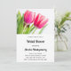 Una invitación a una despedida de soltera con una hermosa fotografía de primavera con 2 tulipanes rosas y hojas verdes brillantes.