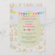 Una encantadora invitación al cumpleaños de los niños. La mitad superior está decorada con un fondo violeta lavanda y una colorida pancarta. El centro tiene una pancarta verde pastel y la mitad inferior de esta encantadora invitación tiene un patrón ilustrado con zorros adorables, pequeños pájaros adorables y árboles frondosos. El centro tiene un marco beige que contiene todos los detalles de tu fiesta.