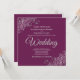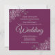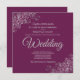 Estas hermosas invitaciones nupciales tienen un diseño sencillo, sofisticado, moda, tradicional y moderno, todo a la vez. El texto es gris, con filigree de Relieve metalizado falso plateado de encaje o adornos florales en las esquinas sobre un fondo magenta o morado de cassis. Ideal para una ceremonia formal o moderna.