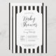 Invitación clásica y atemporal para baby shower con rayas en blanco y negro. Estilos de fuente y diseño personalizables, con un fondo simple con rayas verticales limpias y lineales en la marquesina. Perfecta para invitaciones de baby shower unisex, baby shower para niños y baby shower minimalistas.