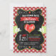 Fresa dulce de Berry con un fondo de gingham rojo y blanco y un marco de pizarra falso. Personalice la edad de su hijo dentro del corazón. Incluye dos motivos de fondo con puntos de polka verde y blanco o el gingham rojo y blanco.