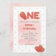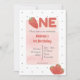 Invitación de cumpleaños con tema de fresa. Letra brillante con fresas. Detalle de lunares dulces en el reverso. Rojo y rosa. Perfecto para el primer cumpleaños de bebé o niño pequeño, Edite fácilmente el texto divertido y moderno. Se ajusta al tema de la fiesta tutti fruity / twotii fruity o tema berry sweet. Encuentre accesorios coincidentes en la tienda Gemma Harlow Creations o transfiera el diseño a sus productos favoritos.