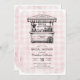 Celebra la futura novia con esta invitación a la ducha de novia "Fresh Off the Market" La hermosa tipografía escrita a mano con gingham rosa es elegante y divertida. Cuenta con un carrito de panadería dibujado a mano con pan francés. Perfecto para una panadería, un mercado francés o una ducha de mercado con encanto. Vea la coordinación de artículos en nuestra tienda, Enchanted Finch.