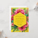 Embrace a joyful and vibrant atmosphere with this lush botanical design. A stunning arrangement of painterly fuchsia peonies and smaller blossoms pops against a radiant marigold and lime green backdrop. The artistic and saturated floral composition is perfect for a cheerful, tropical-themed affair.
