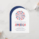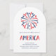 Estas elegantes y divertidas invitaciones rojas blancas y azules a la fiesta del Día de la Independencia presentan fuegos artificiales y estrellas de color rojo y azul, y un texto moderno que dice "América". La invitación como se muestra es una forma de arco, pero puedes cambiar fácilmente la forma así como la redacción para reflejar tu propio tipo de celebración patriótica del 4 de julio.