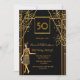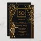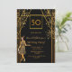 Elegante faux gold y glam para un estilo de 1920'2, 50 cumpleaños temáticos Gatsby (o cualquier edad). Una invitación a la fiesta de cumpleaños al estilo Art Déco en falso oro y negro para una glamorosa celebración. Decorada con un chica flapper de los años 20 y con fuegos artificiales en frente. Muestra la edad de 50 años, el nombre y la información de su fiesta.