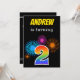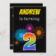 Este divertido y vibrante diseño de invitación para fiestas de cumpleaños presenta un colorido patrón inspirado en fuegos artificiales de celebración, junto con el número "2" que presenta un patrón gradiente inspirado en el arcoiris multicolor, en un fondo de color negro. El nombre de la parte delantera se puede personalizar. En la parte posterior se incluye información personalizado sobre la fiesta de cumpleaños. Las invitaciones a la fiesta de cumpleaños como esta podrían ser usadas cuando se invita a la gente a un fiesta que celebra el segundo cumpleaños de alguien. [~Z0000325]